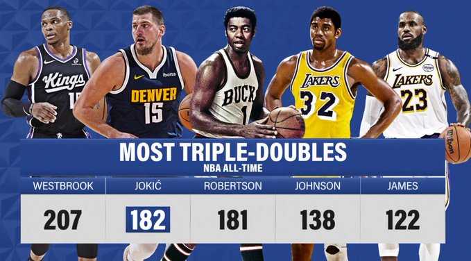 赛中,转播方给出了NBA三双次数历史排名: