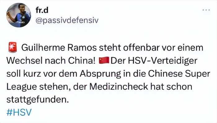2026年1月21日,包括《图片报》在内的多家外国媒体报道,德甲球队汉堡后卫吉列尔梅-拉莫斯将正式加盟中超球队北京国安,转会费仅为10万欧元。据了解,拉莫斯已经在汉堡完成了体检,即将飞往北京。此前,已经有汉堡球迷通过社交媒体公开表示,汉堡后卫拉莫斯完成了体检,将加盟一支中超球队。如今看来,这支中超球队就是北京国安。